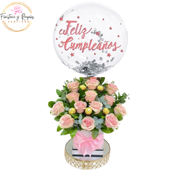 BOX DE 13 ROSAS, 5 BOMBONES FERREROS ROCHER Y GLOBO BURBUJA