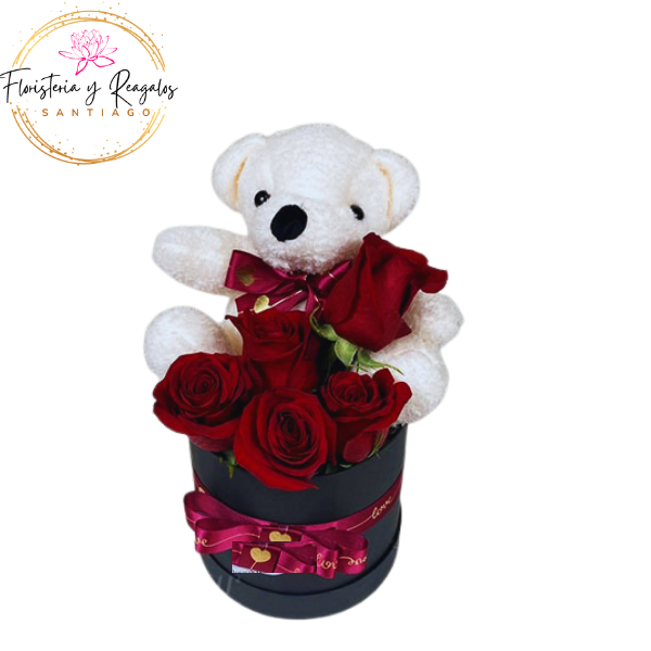 BOX REDONDO 5 ROSAS 3 GIRASOL + PELUCHE 20 CM $35.590