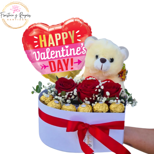 BOX SAN VALENTIN CON PELUCHITO 15CM, 1 ROSA, 3 FERREROS ROCHER Y GLOBO $23.990