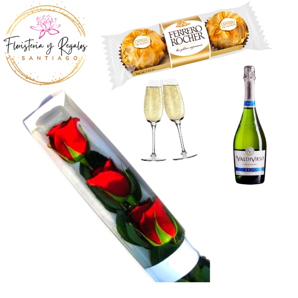 InicioDIA DE LOS ENAMORADOS CAJA VISORA DE 3 ROSAS FERREROS ROCHER DE 3 UND + CHAMPGNE 375ML + COPAS