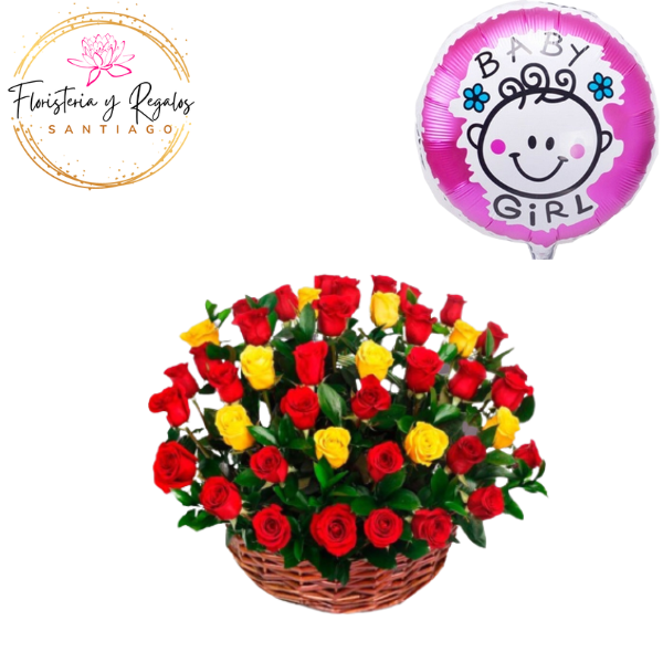 CANASTA DE 50  ROSAS DISPERSA + GLOBO