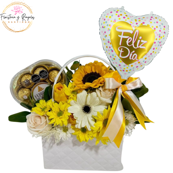 CARTERA DIA DE LA NOVIA DE 1 GIRASOL, 1 GERBERA,3 ROSAS, MARGARITAS, BOMBONES FERREROS ROCHER 100GRS Y GLOBO