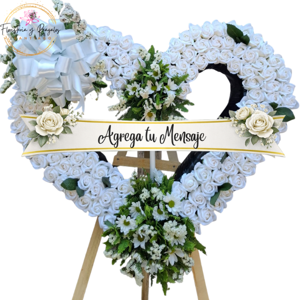 InicioFUNEBRES/CONDOLENCIAS CORONA CORAZON CON 100 ROSAS JABON, TOPIARIO, CINTA, LAZO Y ATRIL