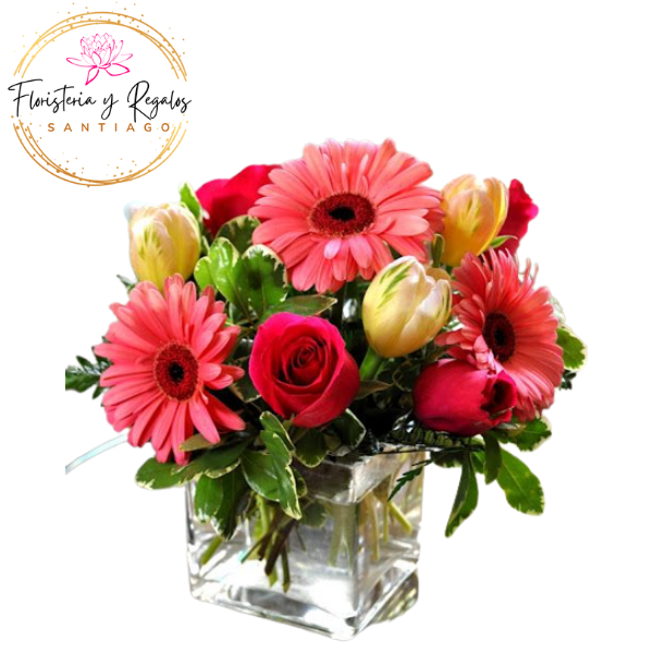 CUBO DE 3 ROSAS 3 GERBERAS 5 TULIPANES
