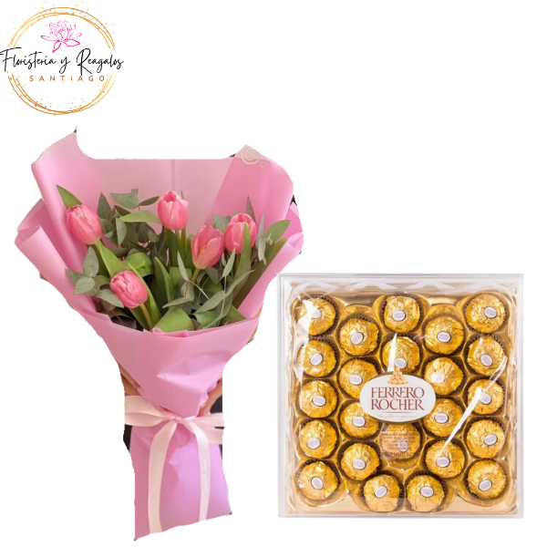 InicioPROMOCIONES Y OFERTAS ELEGANTE RAMO DE 5 TULIPANES CON DELICIOSA CAJA DE BOMBONES FERREROS ROCHER DE 300G