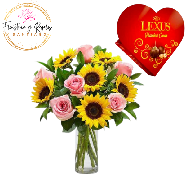 FLORERO DE 6 ROSAS 6 GIRASOLES Y BOMBONES LEXUS