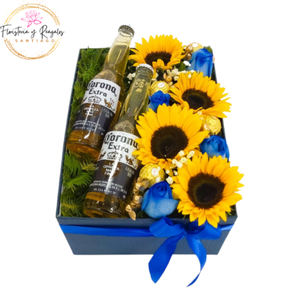 CAJA RECTANGULAR DE 4 ROSAS AZULES, 4 GIRASOLES, 4 BOMBONES Y 2 CERVEZAS