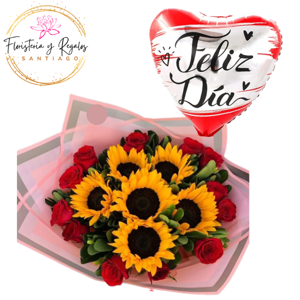 InicioDIA DE LOS ENAMORADOS RAMO 12 ROSAS, 6 GIRASOLES Y GLOBO