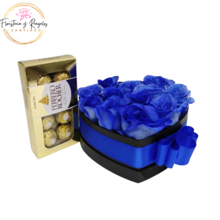 CAJA CORAZON 12 ROSAS AZUL Y BOMBONES FERREROS ROCHER