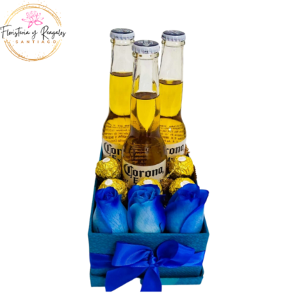 CAJA DE 3 ROSAS, 5 BOMBONES Y 3 CERVEZAS
