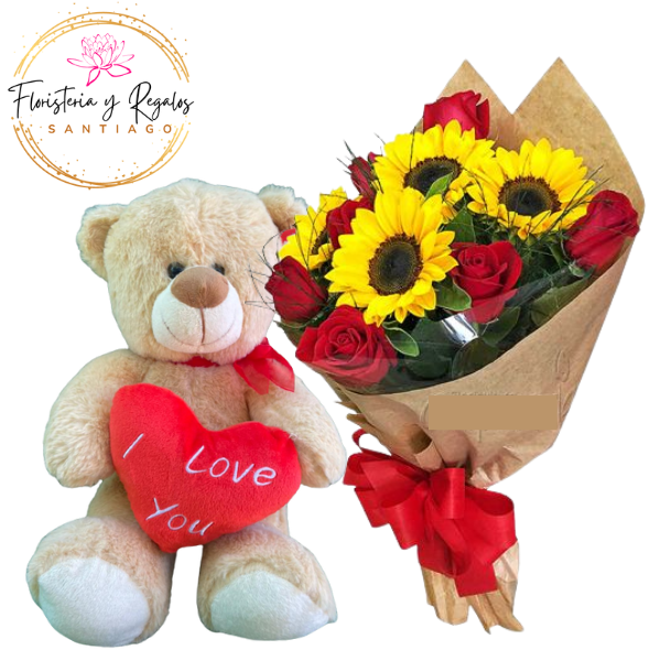 RAMO 6 ROSAS, 4 GIRASOLES Y PELUCHE 30CM