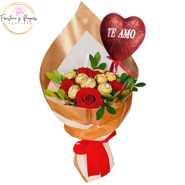 RAMO AMOR DE 5 ROSAS, 8 FERREROS ROCHER Y TOPPER