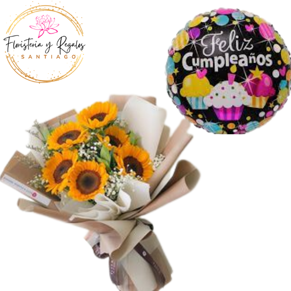 InicioREGALOS DE CUMPLEAÑOS RAMO DE 6 GIRASOLES + GLOBO