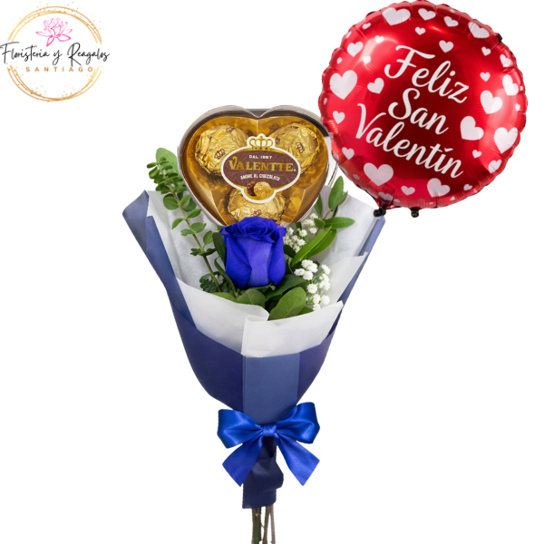 RAMO PARA ELLOS CON 1 ROSA AZUL, BOMBONES VALENTTE 3 UNID Y GLOBITO