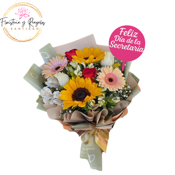 RAMO PARA LA MEJOR SECRETARIA 2 GIRASOLES 2 GERBERAS 2 ROSAS FOLLAJE Y TOPPER