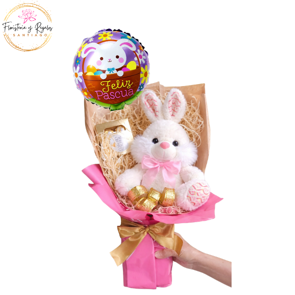 RAMO PASCUA: 1 PELUCHE DE 20CM, FERREROS ROCHER 100GRS, HUEVITOS Y GLOBO