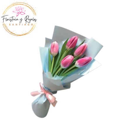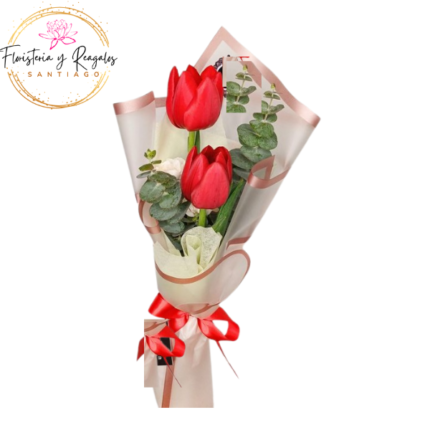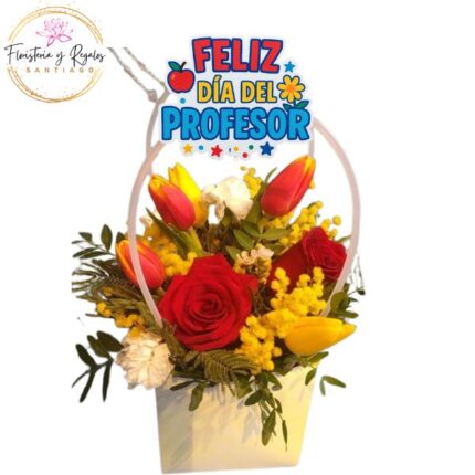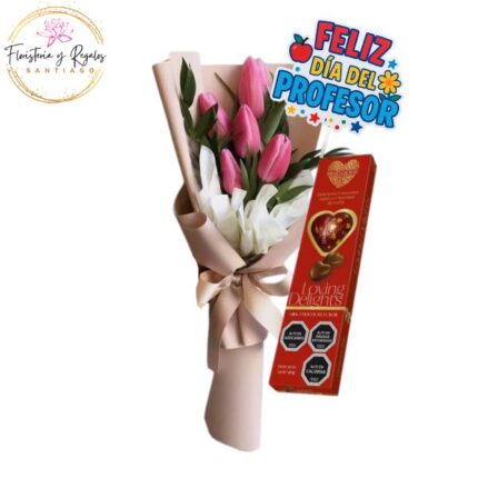 RAMO DIA DEL PROFESOR DE 5 TULIPANES, BOMBONES HEARTS FOR YOU 4 UNID Y TOPPER