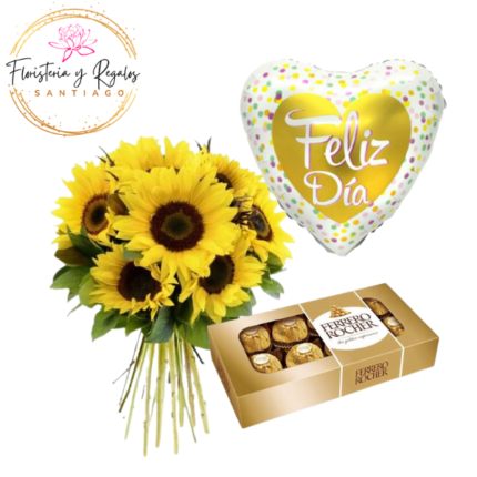 RAMO DE 1 ROSA, 1 GIRASOL Y BOMBONES FERREROS 3 UNID