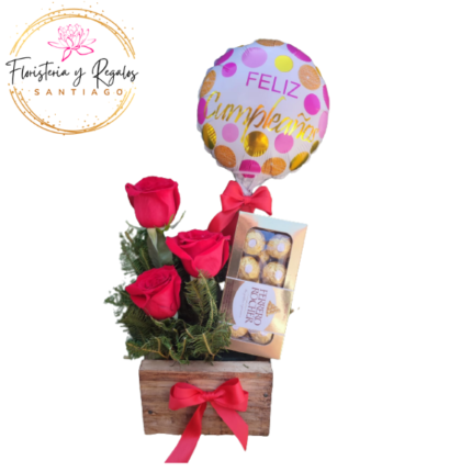 BASE DE 3 ROSAS + FERREROS ROCHER 100GRS Y GLOBOS
