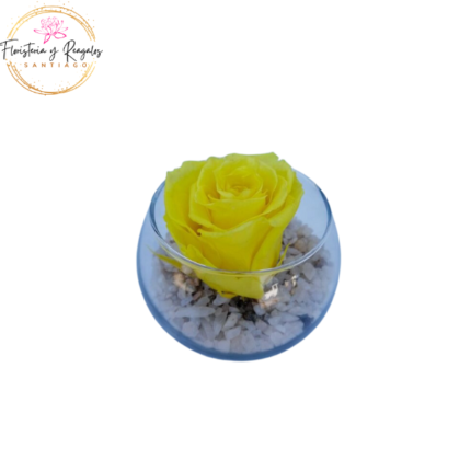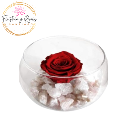 ROSA PRESERVADA EN PECERA DE VIDRIO Y PIEDRAS