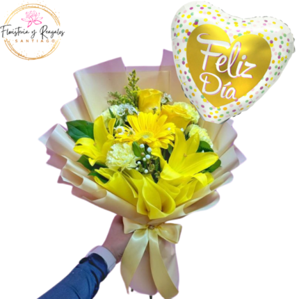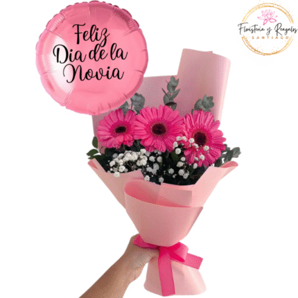RAMO DIA DE LA NOVIA DE 3 GERBERAS, FOLLAJE Y GLOBO