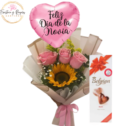RAMO DIA DE LA NOVIA DE 3 ROSAS, 1 GIRASOL, BOMBONES BELGIAN Y GLOBO