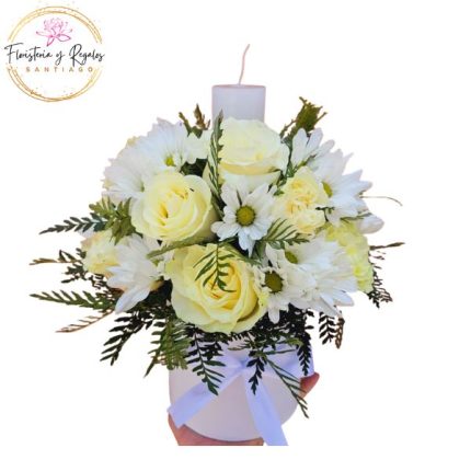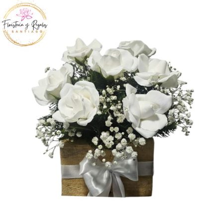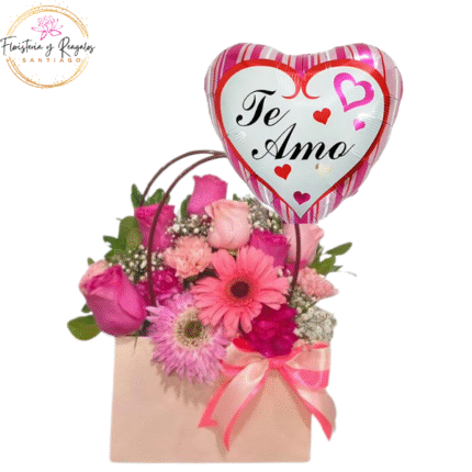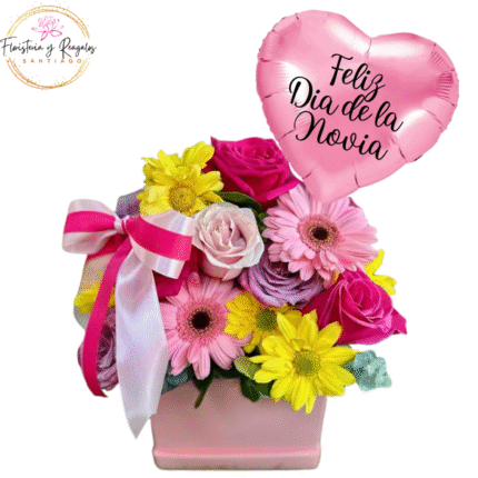 BOX DIA DE LA NOVIA DE 5 ROSAS, 2 GERBERAS, MARGARITAS Y GLOBO