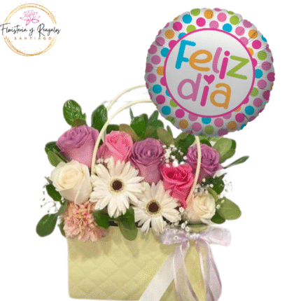 CARTERA DIA DE LA NOVIA DE 7 ROSAS, 2 GERBERAS Y GLOBO