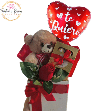 BOX DIA DE LA NOVIA CON PELUCHE DE 20CM, 1 ROSA, FERRERO ROCHER 100GRS Y GLOBO