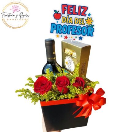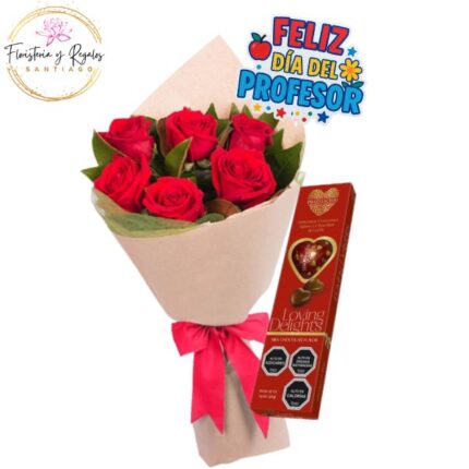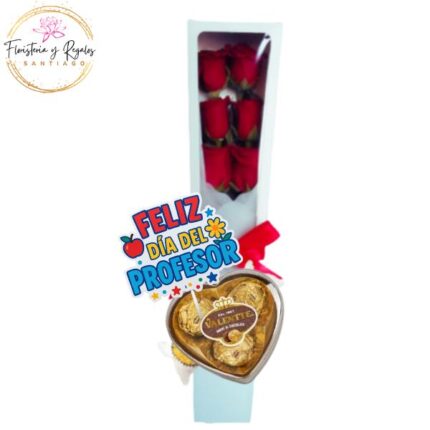CAJA VISORA DIA DEL PROFESOR CON 6 ROSAS, BOMBONES CORAZON Y TOPPER