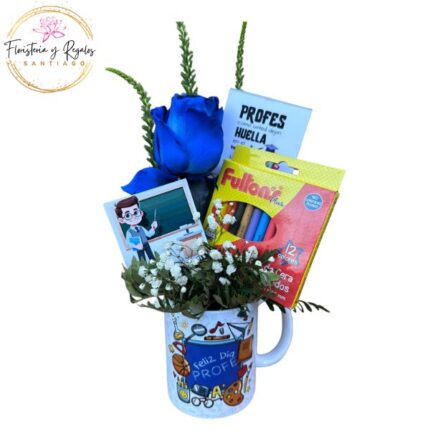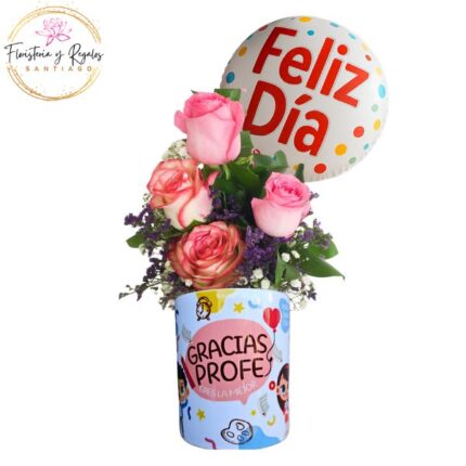 TAZA DIA DEL PROFESOR CON 4 ROSAS Y GLOBO