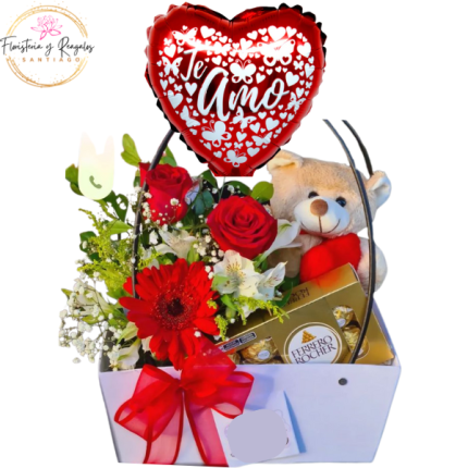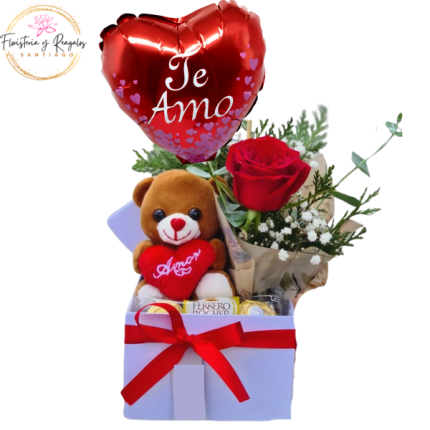 BASE DE MADERA CON 1 ROSA, PELUCHE DE 25CM, BOMBONES 5 CORAZON, 2 CHOCOLATITOS Y GLOBO