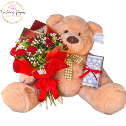 REGALO SAN VALENTIN: RAMO 6 ROSAS, BOMBONES FERREROS ROCHER 100GRS Y PELUCHE DE 60CM