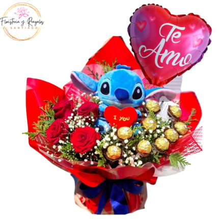 CAJA CON ENVOLTURA DE 4 ROSAS, STITCH 15CM, 9 BOMBONES FERREROS ROCHER Y GLOBITO